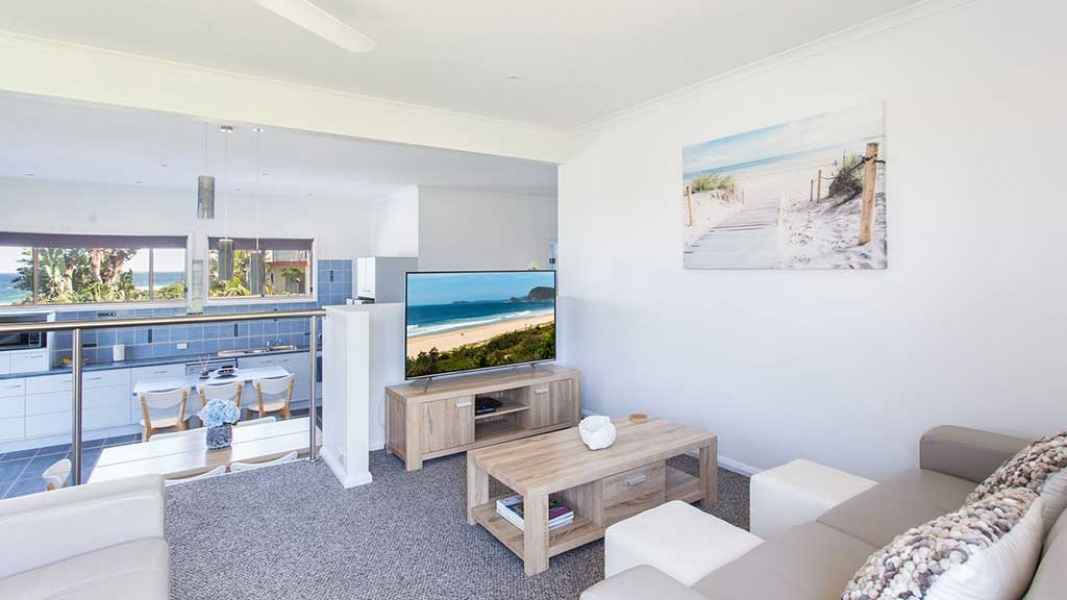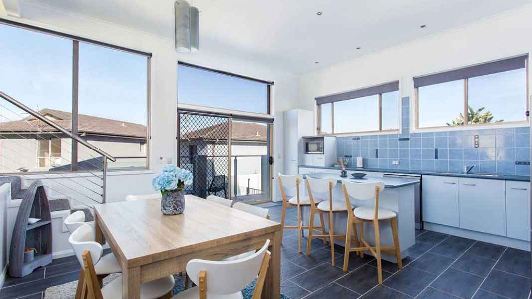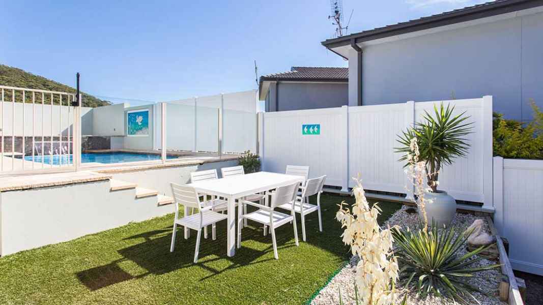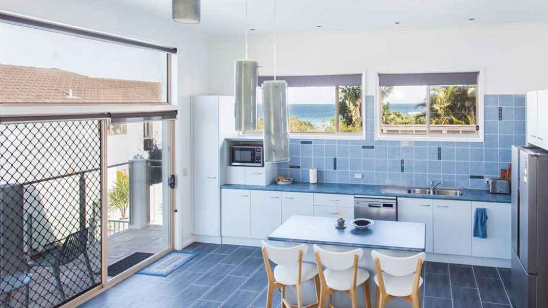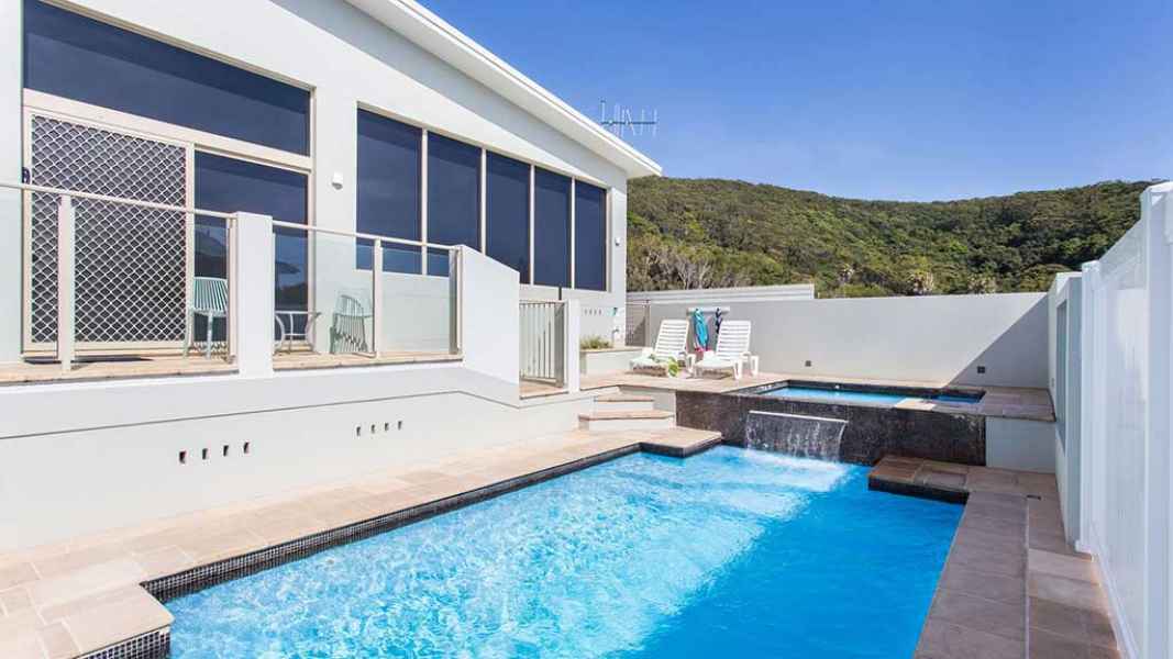 By The Pool is a modern, light and bright spacious beach home. When you have enjoyed your day at Bluey’s Beach (metres away) you have a sparkling pool and spa waiting for you to enjoy your glass of wine while watching the sun go down. By The Pool has a fully equipped kitchen with dishwasher, double fridge and island bench. There are two bedrooms which can sleep 5 and have ceiling fans.
